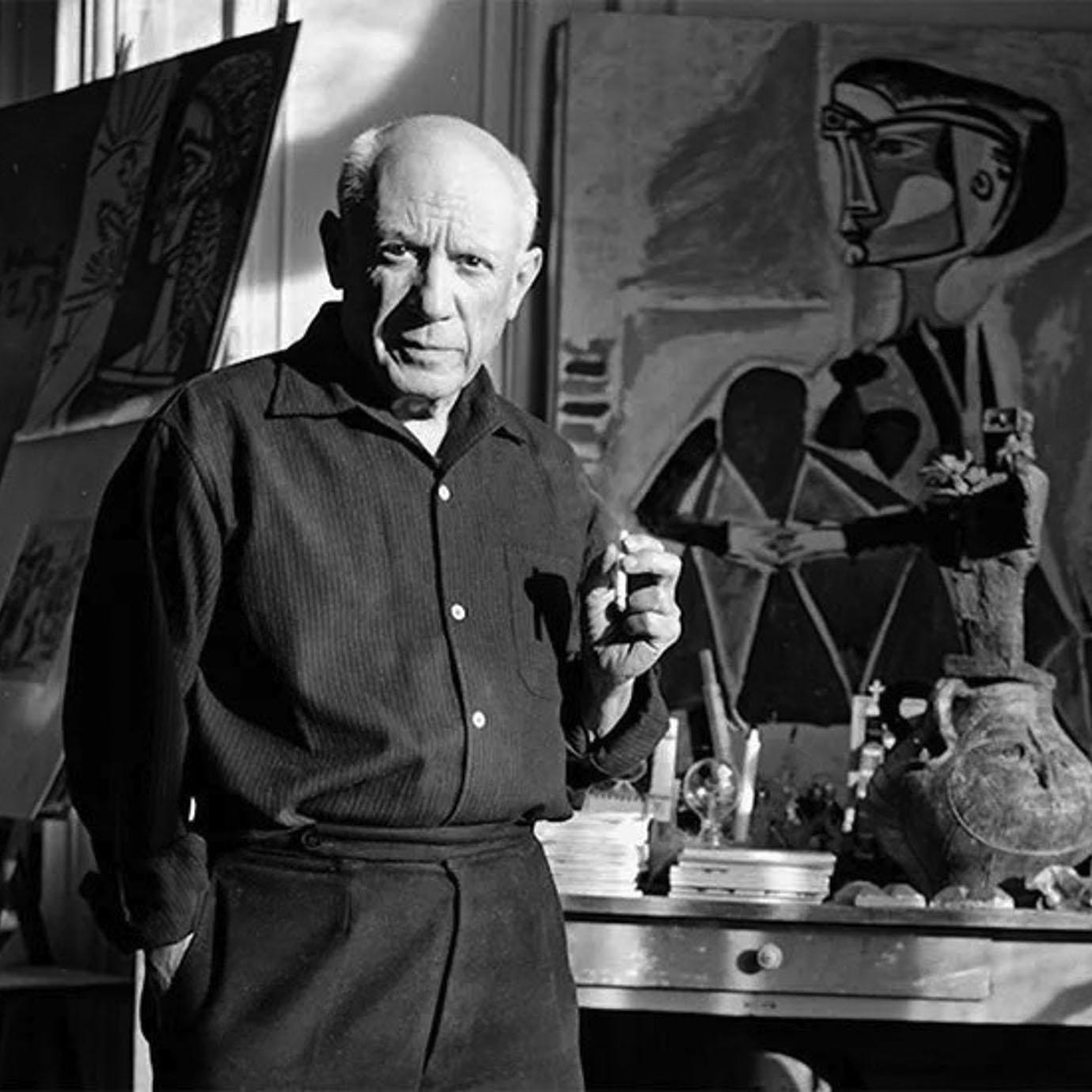 Pablo Picasso (1881-1973) est un peintre, sculpteur et dessinateur espagnol, considéré comme l’un des artistes les plus influents du XXe siècle. Génie précoce, il révolutionne l’art avec Georges Braque en cofondant le cubisme, qui déconstruit la perspective traditionnelle. Son œuvre, immense et variée, traverse de nombreux styles : période bleue, période rose, cubisme, classicisme, surréalisme. Engagé politiquement, il crée Guernica, une fresque puissante contre la guerre et la barbarie. Picasso ne cesse d’expérimenter, mêlant peinture, sculpture, céramique, gravure et collage avec audace ; il transforme chaque medium en terrain d’innovation et de liberté. Sa créativité inépuisable et son impact sur l’art moderne sont inégalés.