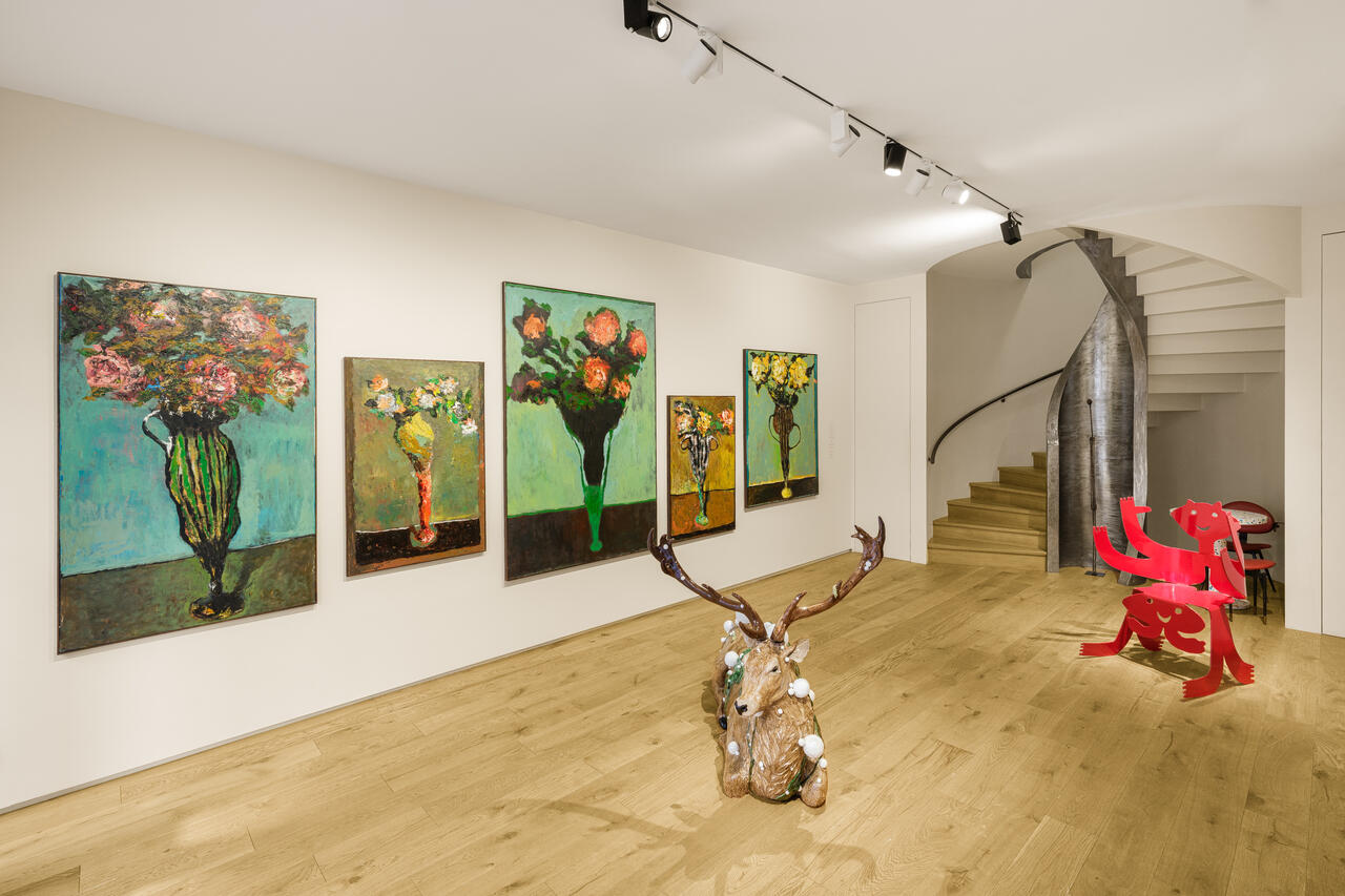 Niyaz NajafovSans titre (Cinq roses cerises, vase à rayures vertes et noires), 2022 Huile sur toile 162 x 96 cm Inquire